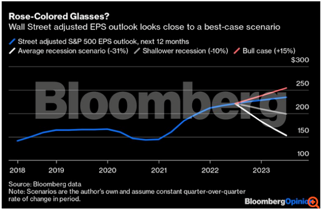 Από το 1960, η μέση πτώση των κερδών σε περίοδο ύφεσης (από το ζενίθ στο ναδίρ) είναι περίπου 31%, με βάση τα στοιχεία του καθηγητή του πανεπιστημίου, Yale Robert Shiller. Ωστόσο, οι αναλυτές μετοχών από την πλευρά των πωλήσεων δεν είναι καν κοντά στο να ενσωματώσουν στις προβλέψεις τους μια τέτοια πτώση. Στην πραγματικότητα, οι εκτιμήσεις τόσο για το 2022 όσο και για το 2023 εξακολουθούν να υποδηλώνουν ότι τα κυλιόμενα κέρδη 12 μηνών θα διατηρήσουν τη σταθερά ανοδική τους κλίση, υποδηλώνοντας κάτι αρκετά κοντινό προς το βέλτιστο σενάριο.